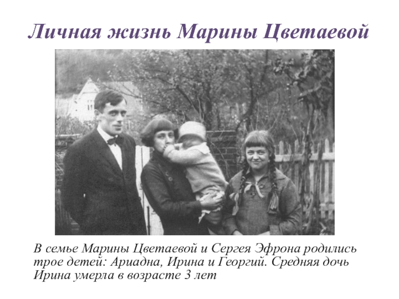 Личная жизнь Марины Цветаевой В семье Марины Цветаевой и Сергея Эфрона родились трое детей: Ариадна, Ирина и