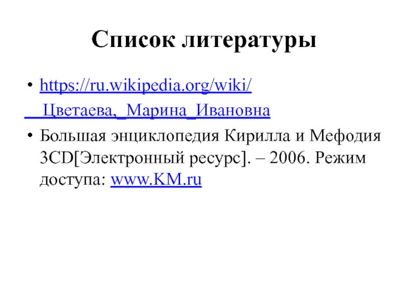 Список литературы https://ru.wikipedia.org/wiki/  Цветаева,_Марина_ИвановнаБольшая энциклопедия Кирилла и Мефодия 3CD[Электронный ресурс]. – 2006. Режим доступа: www.KM.ru