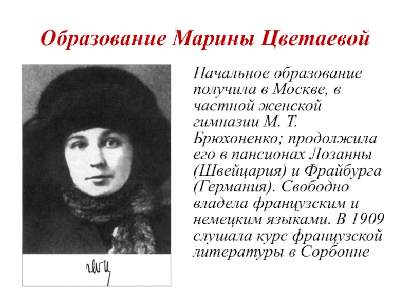 Образование Марины Цветаевой Начальное образование получила в Москве, в частной женской гимназии М. Т. Брюхоненко; продолжила его