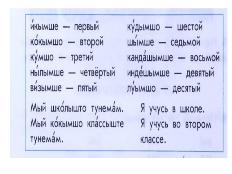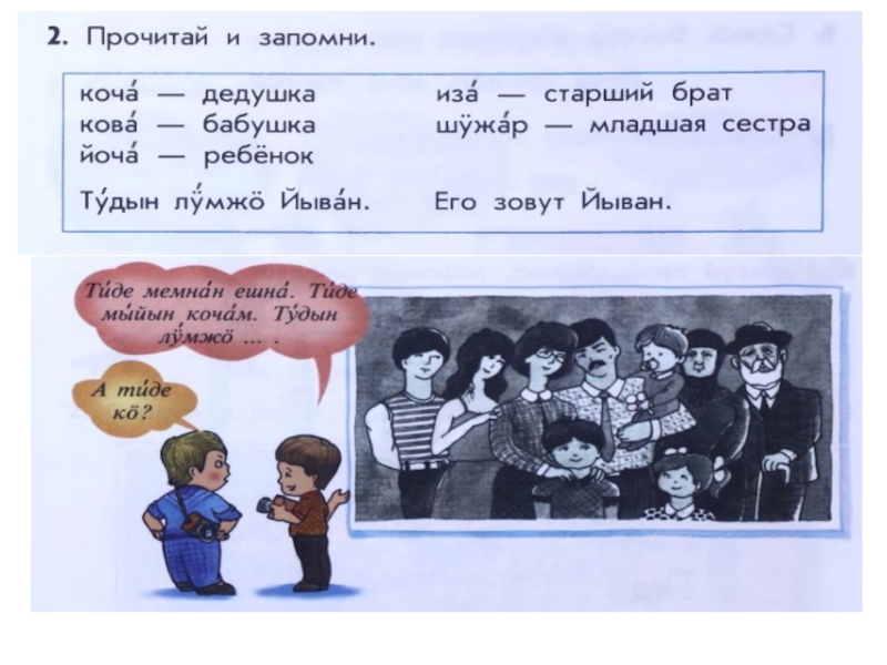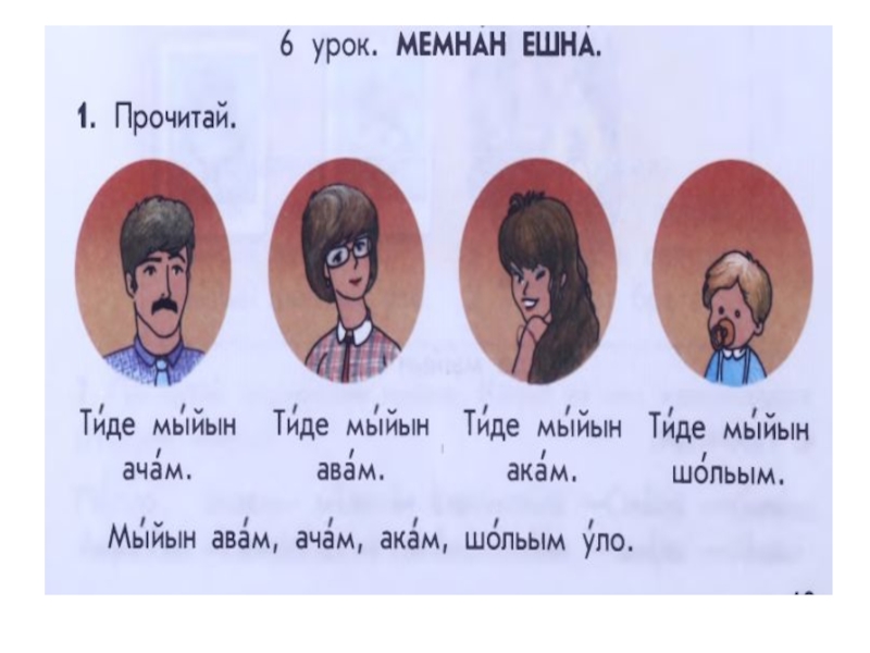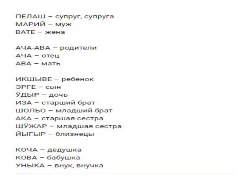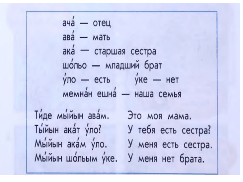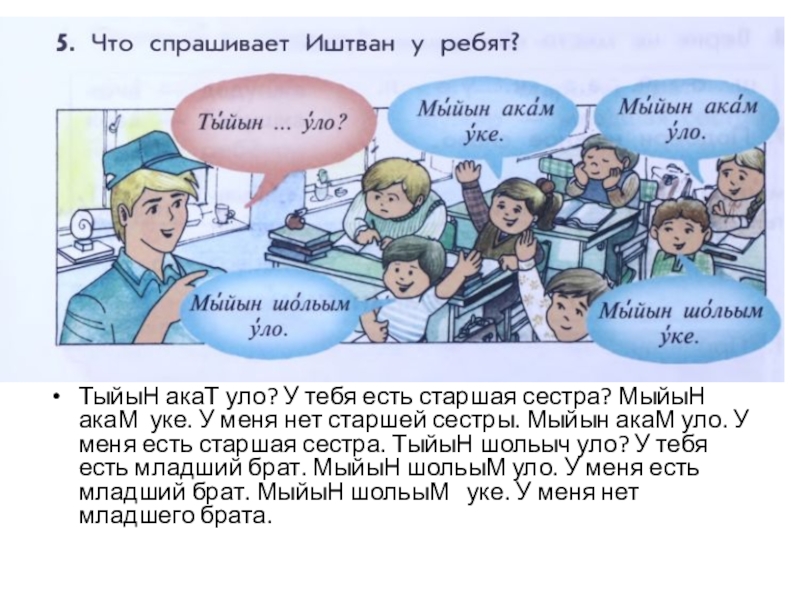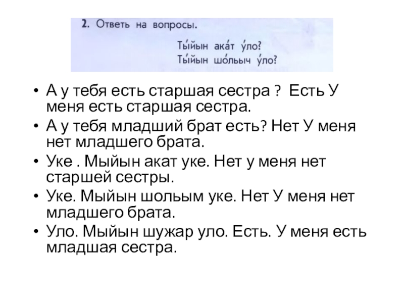 меня есть старшая сестра. ТыйыН шольыч уло? У тебя есть младший брат. МыйыН шольыМ уло. У меня есть младший брат. МыйыН шольыМ уке. У меня нет младшего брата.