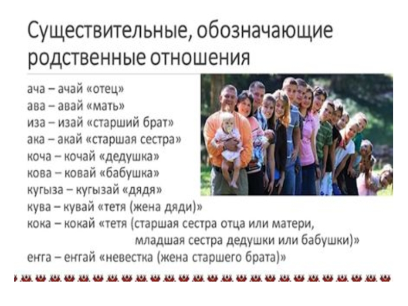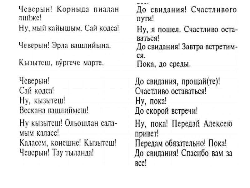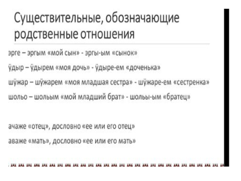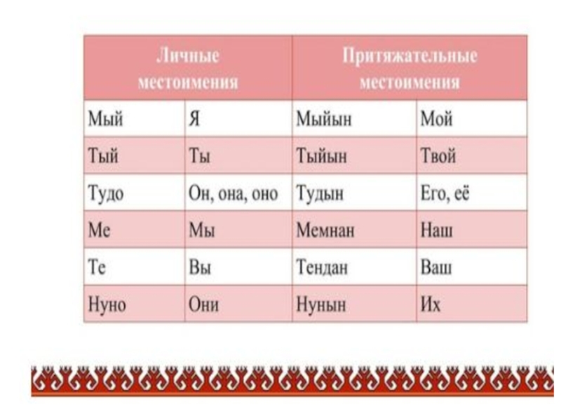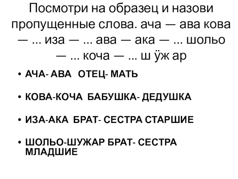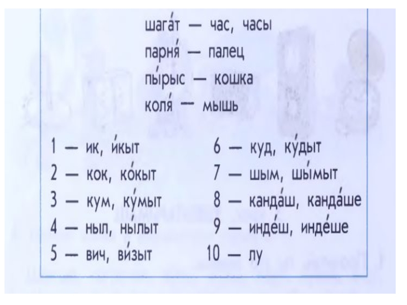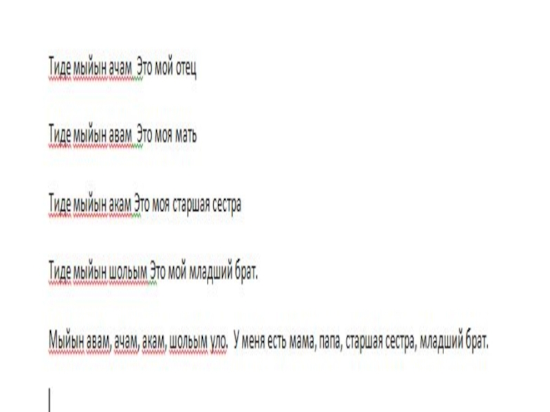меня есть старшая сестра. ТыйыН шольыч уло? У тебя есть младший брат. МыйыН шольыМ уло. У меня есть младший брат. МыйыН шольыМ уке. У меня нет младшего брата.