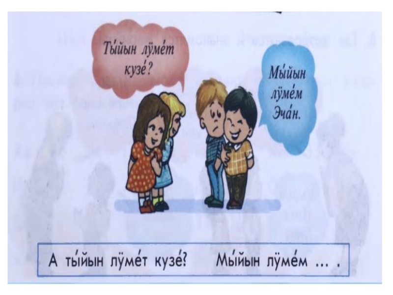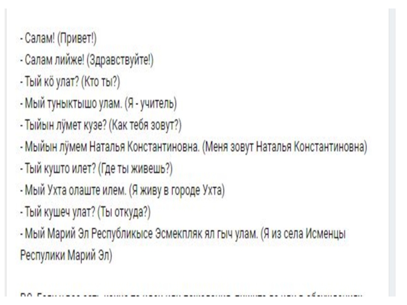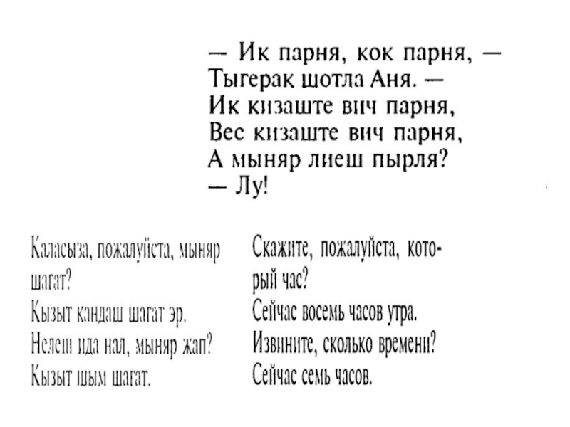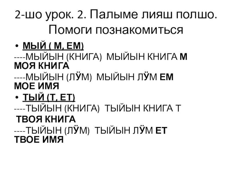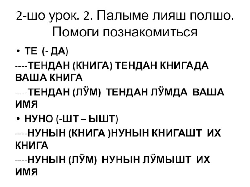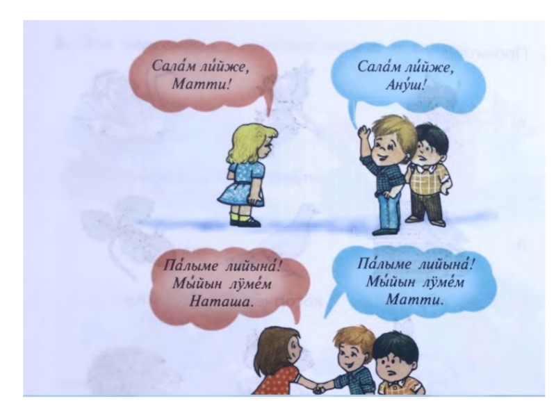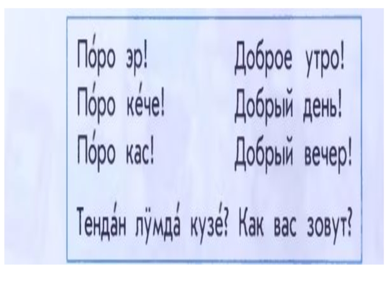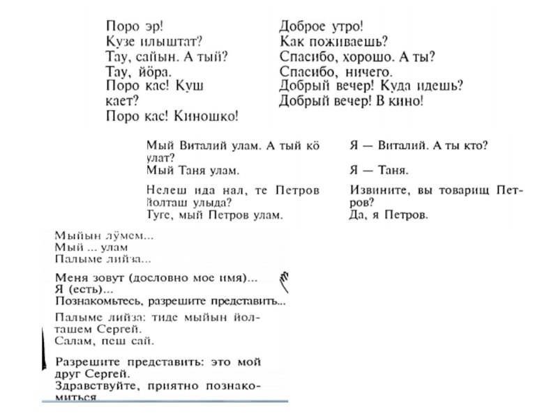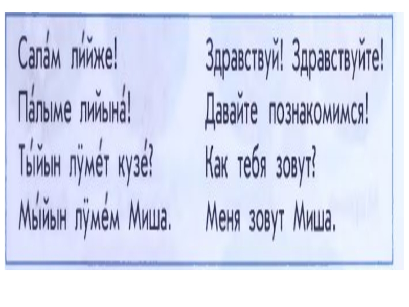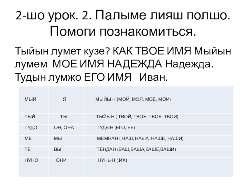 Тыйын лумет кузе? КАК ТВОЕ ИМЯ Мыйын лумем МОЕ ИМЯ НАДЕЖДА Надежда. Тудын лумжо ЕГО ИМЯ Иван.