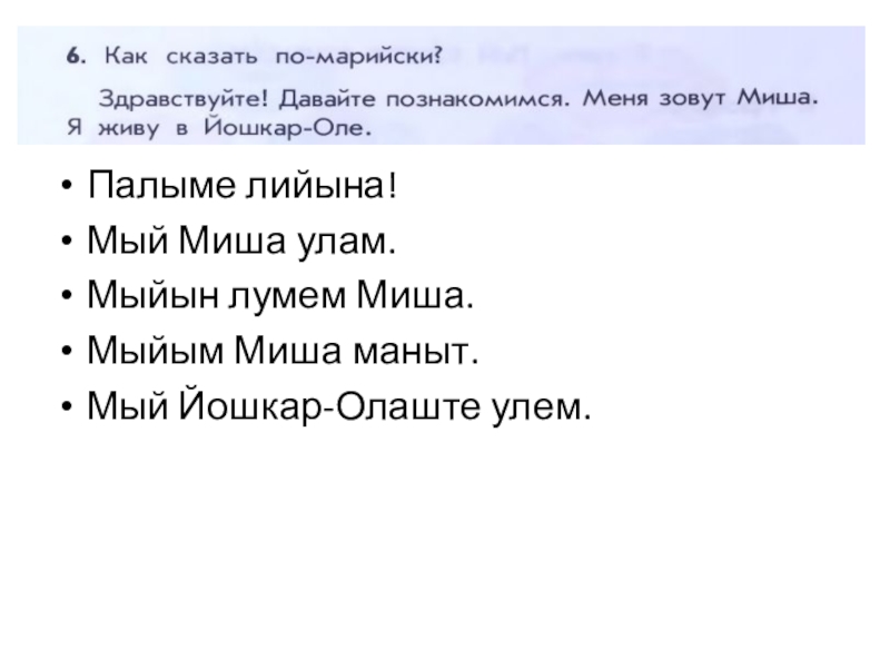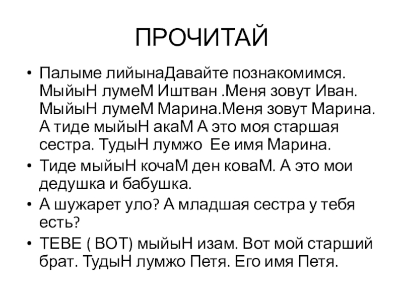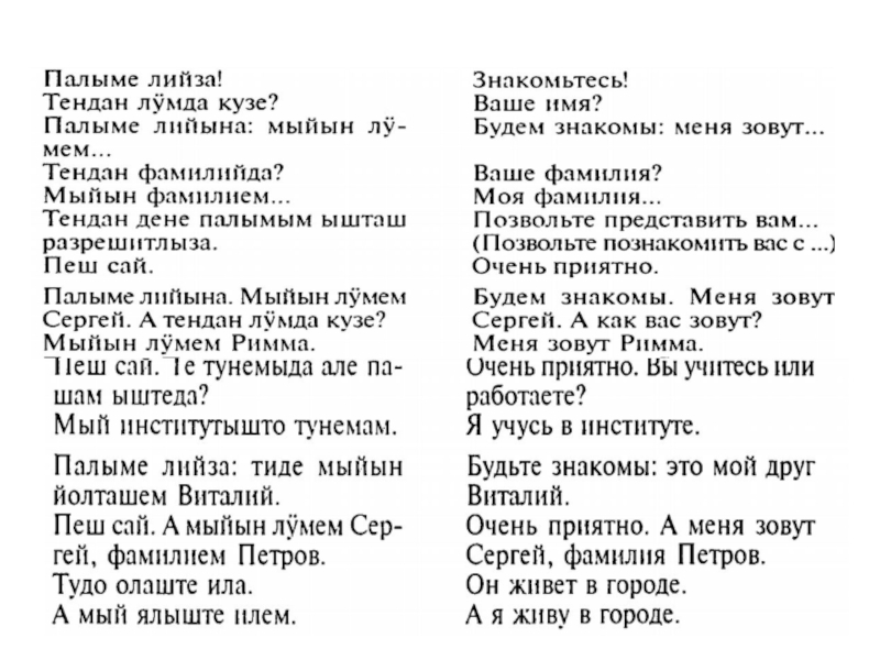 Палыме лийынаДавайте познакомимся. МыйыН лумеМ Иштван .Меня зовут Иван.