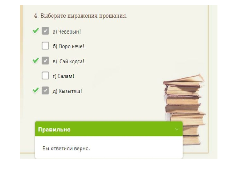 книга, 3 тетрадь- кум тетрадь, 4 карандаш-ныл карандаш, 2 ручка – кок ручка.