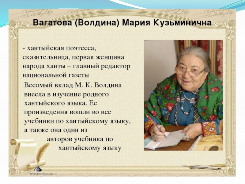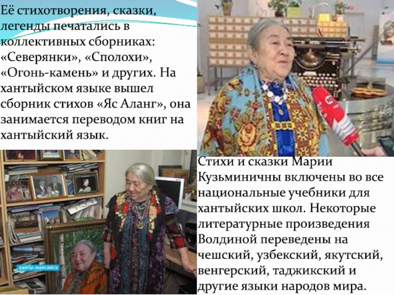 Стихи и сказки Марии Кузьминичны включены во все национальные учебники для хантыйских школ. Некоторые литературные произведения Волдиной переведены на чешский, узбекский, якутский, венгерский, таджикский и другие языки народов мира.