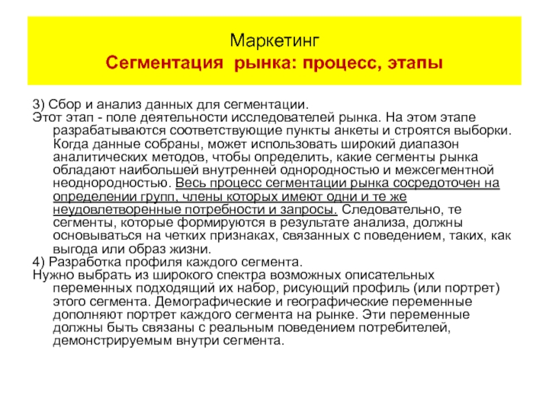 и строятся выборки. Когда данные собраны, может использовать широкий диапазон аналитических методов, чтобы определить, какие сегменты рынка обладают наибольшей внутренней однородностью и межсегментной неоднородностью. Весь процесс сегментации рынка сосредоточен на определении групп, члены которых имеют одни и те же неудовлетворенные потребности и запросы. Следовательно, те сегменты, которые формируются в результате анализа, должны основываться на четких признаках, связанных с поведением, таких, как выгода или образ жизни.