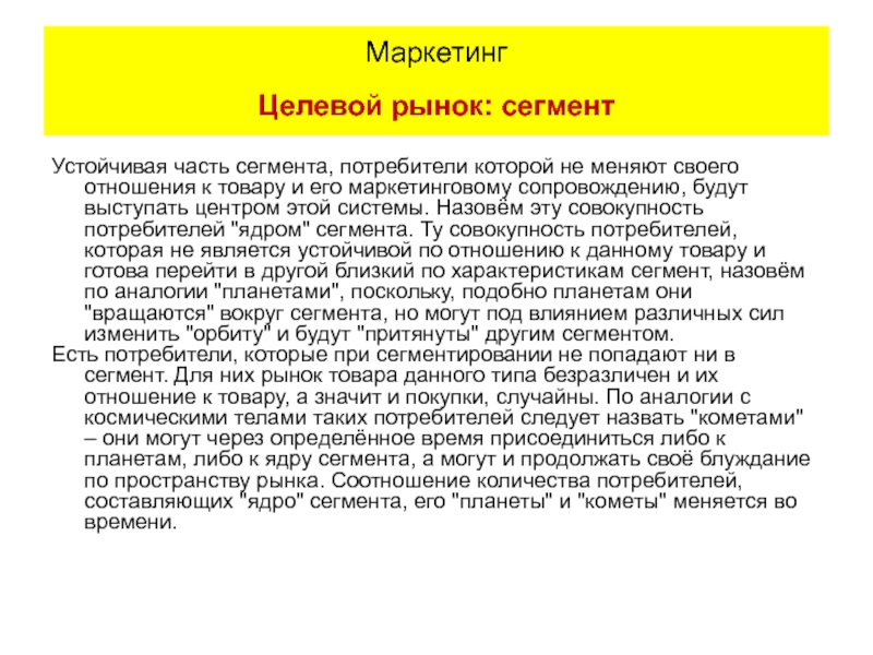 Назовём эту совокупность потребителей "ядром" сегмента. Ту совокупность потребителей, которая не является устойчивой по отношению к данному товару и готова перейти в другой близкий по характеристикам сегмент, назовём по аналогии "планетами", поскольку, подобно планетам они "вращаются" вокруг сегмента, но могут под влиянием различных сил изменить "орбиту" и будут "притянуты" другим сегментом.