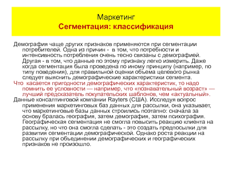 Слайд 43Демография чаще других признаков применяются при сегментации потребителей. Одна из