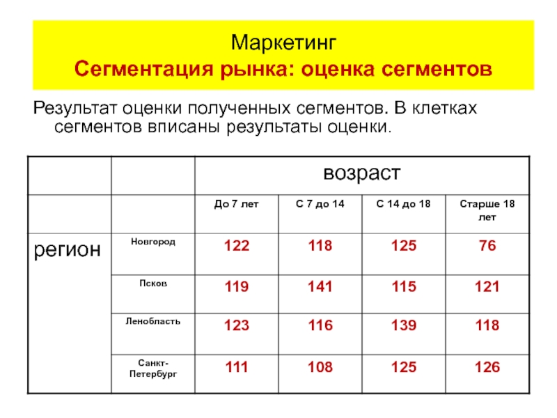 Результат оценки полученных сегментов. В клетках сегментов вписаны результаты оценки. Маркетинг Сегментация рынка: оценка сегментов