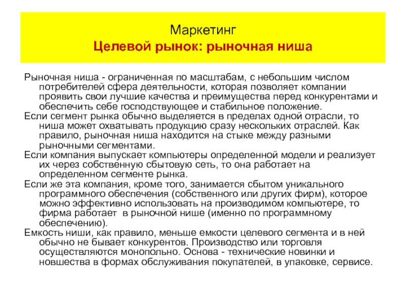 Емкость ниши, как правило, меньше емкости целевого сегмента и в ней обычно не бывает конкурентов. Производство или торговля осуществляются монопольно. Основа - технические новинки и новшества в формах обслуживания покупателей, в упаковке, сервисе.