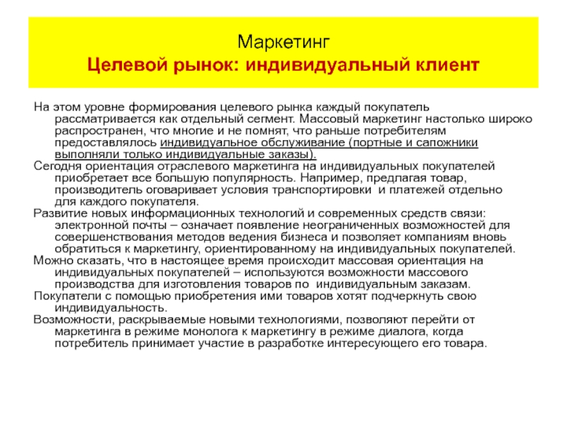 Маркетинг Целевой рынок: индивидуальный клиент