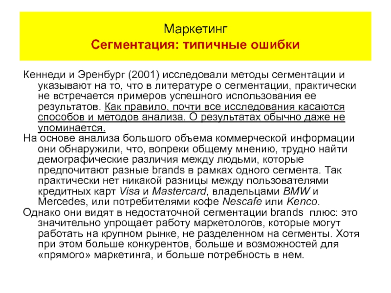 Кеннеди и Эренбург (2001) исследовали методы сегментации и указывают на то, что в литературе о сегментации, практически