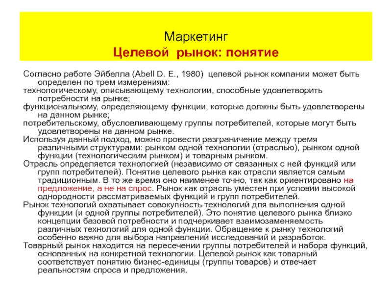 Товарный рынок находится на пересечении группы потребителей и набора функций, основанных на конкретной технологии. Целевой рынок как товарный соответствует понятию бизнес-единицы (группы товаров) и отвечает реальностям спроса и предложения.