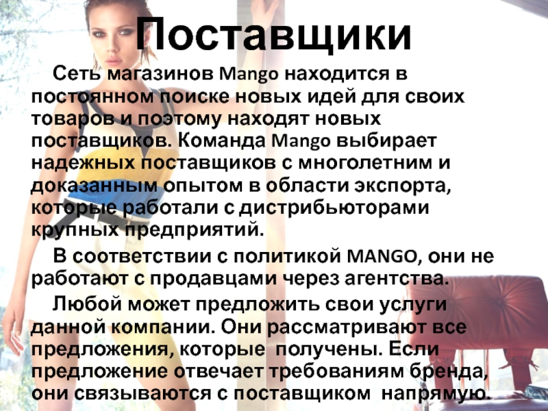 своих товаров и поэтому находят новых поставщиков. Команда Mango выбирает