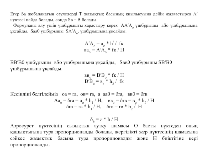 А және В нүктелерінің ортогональды проекциясы Т басты жазықтықта Ао және Во нүктелерінде болады, аэросуретте а нүктесінің бейнеленуі жергілікті жердің А нүктесі болады, ао – Ао, нүкте в – В, во – Во