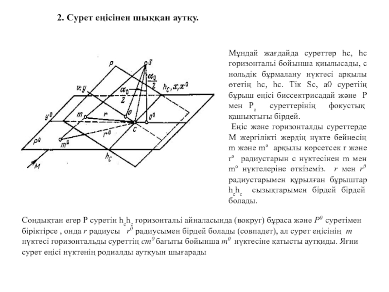 Сондықтан егер Р суретін hсhс горизонтальі айналасында (вокруг) бұраса және Р0 суретімен біріктірсе , онда r радиусы r0 радиусымен бірдей болады (совпадет), ал сурет еңісінің m нүктесі горизонтальды суреттің сm0 бағыты бойынша m0 нүктесіне қатысты аутқиды. Яғни сурет еңісі нүктенің родиалды аутқуын шығарады