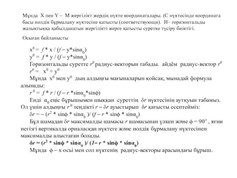 Х = Н * х / (f – y*sin0) = H * x0 / f