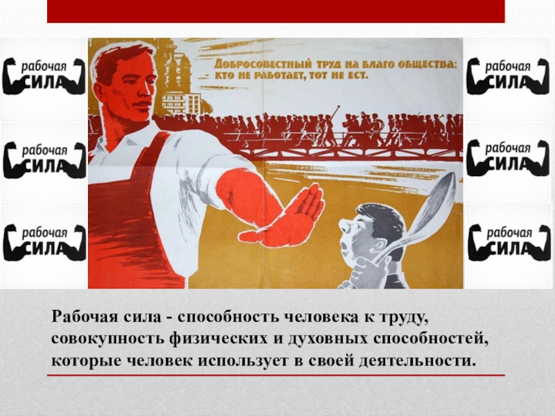 Слайд 4Рабочая сила - способность человека к труду, совокупность физических и