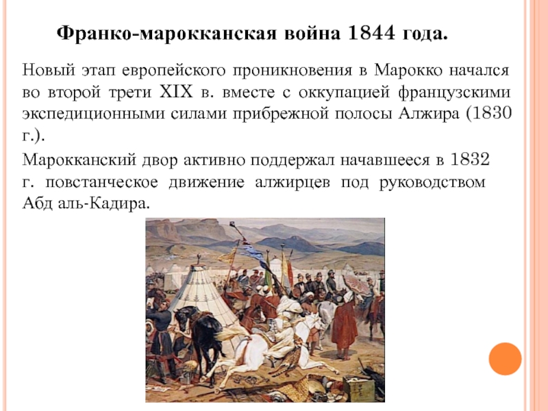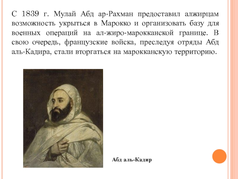 Марокканский двор активно поддержал начавшееся в 1832 г. повстанческое движение алжирцев под руководством Абд аль-Кадира.