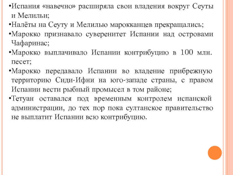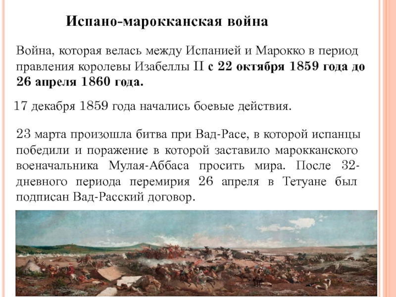 23 марта произошла битва при Вад-Расе, в которой испанцы победили и поражение в которой заставило марокканского военачальника Мулая-Аббаса просить мира. После 32-дневного периода перемирия 26 апреля в Тетуане был подписан Вад-Расский договор.