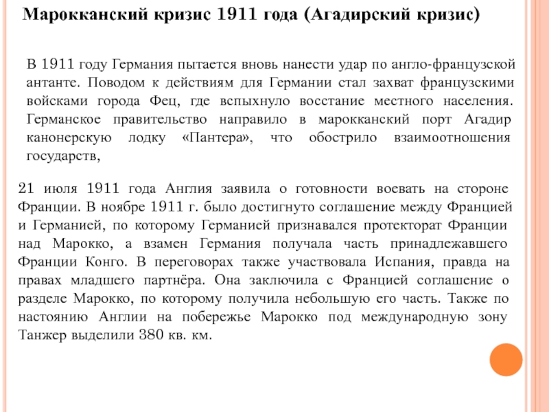 21 июля 1911 года Англия заявила о готовности воевать на стороне Франции. В ноябре 1911 г. было достигнуто соглашение между Францией и Германией, по которому Германией признавался протекторат Франции над Марокко, а взамен Германия получала часть принадлежавшего Франции Конго. В переговорах также участвовала Испания, правда на правах младшего партнёра. Она заключила с Францией соглашение о разделе Марокко, по которому получила небольшую его часть. Также по настоянию Англии на побережье Марокко под международную зону Танжер выделили 380 кв. км.