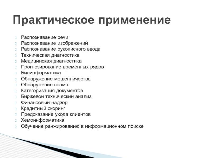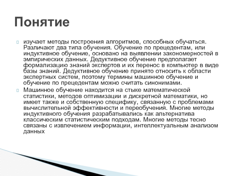в эмпирических данных. Дедуктивное обучение предполагает формализацию знаний экспертов и их перенос в компьютер в виде базы знаний. Дедуктивное обучение принято относить к области экспертных систем, поэтому термины машинное обучение и обучение по прецедентам можно считать синонимами.Машинное обучение находится на стыке математической статистики, методов оптимизации и дискретной математики, но имеет также и собственную специфику, связанную с проблемами вычислительной эффективности и переобучения. Многие методы индуктивного обучения разрабатывались как альтернатива классическим статистическим подходам. Многие методы тесно связаны с извлечением информации, интеллектуальным анализом данных