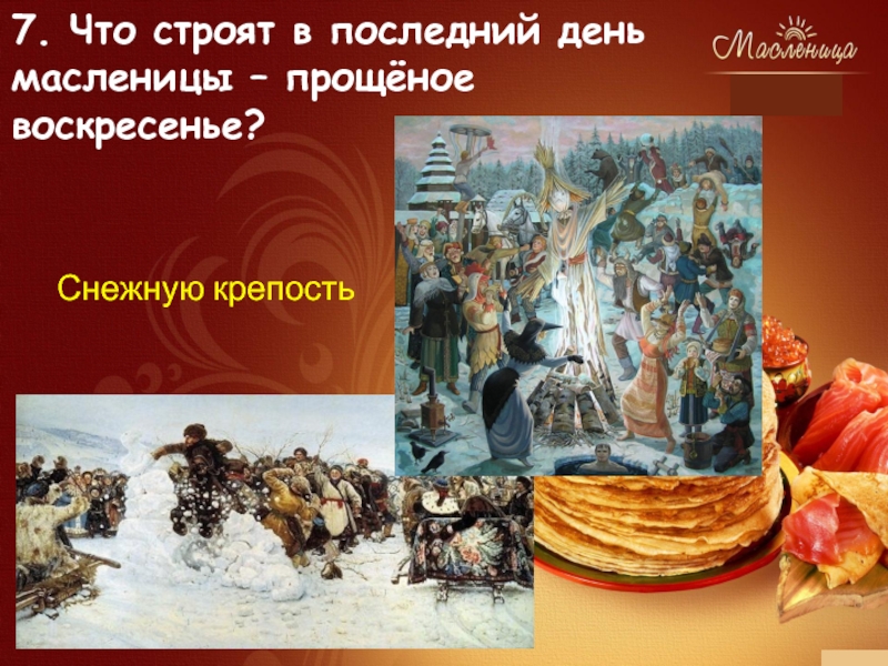 7. Что строят в последний день масленицы – прощёное воскресенье? Снежную крепость