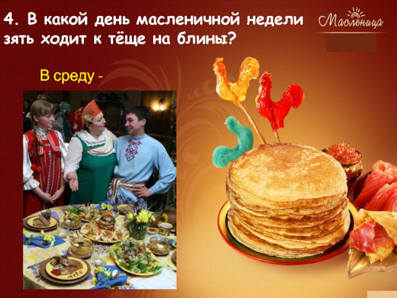 4. В какой день масленичной недели зять ходит к тёще на блины?В среду - лакомку