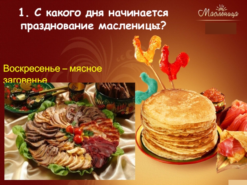 1. С какого дня начинается празднование масленицы?Воскресенье – мясное заговенье