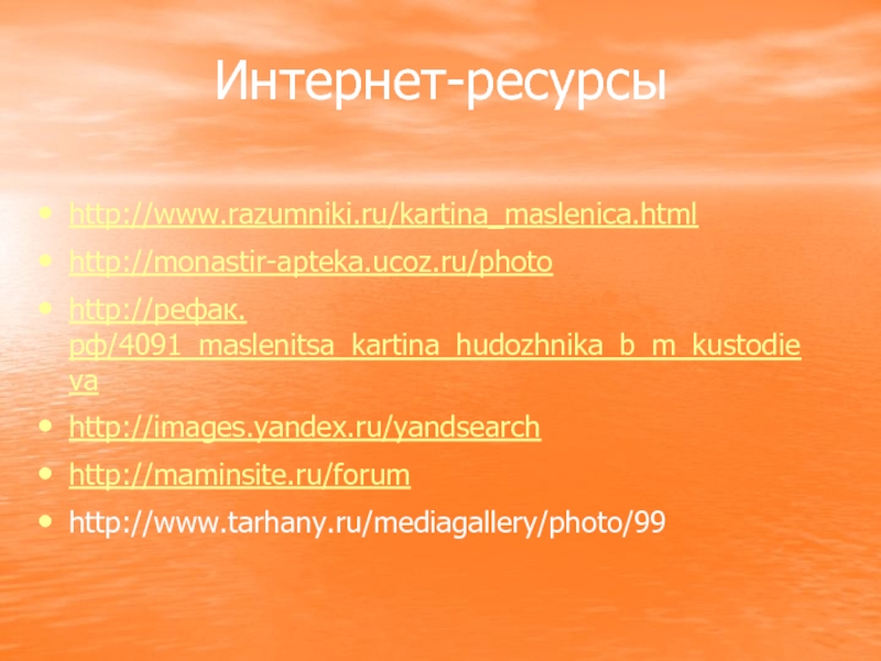 Интернет-ресурсыhttp://www.razumniki.ru/kartina_maslenica.htmlhttp://monastir-apteka.ucoz.ru/photohttp://рефак.рф/4091_maslenitsa_kartina_hudozhnika_b_m_kustodievahttp://images.yandex.ru/yandsearchhttp://maminsite.ru/forumhttp://www.tarhany.ru/mediagallery/photo/99