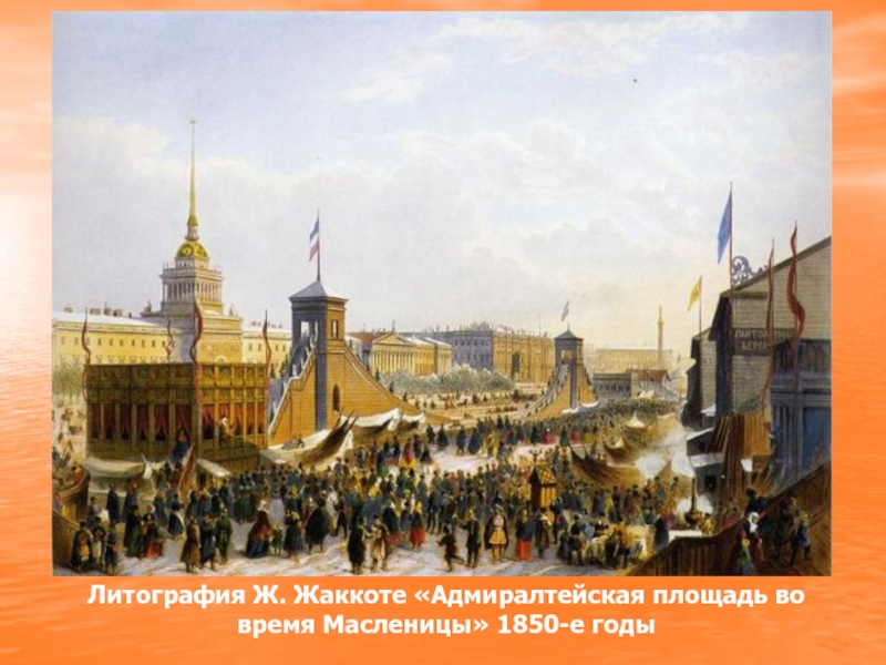 Слайд 18Литография Ж. Жаккоте «Адмиралтейская площадь во время Масленицы» 1850-е годы