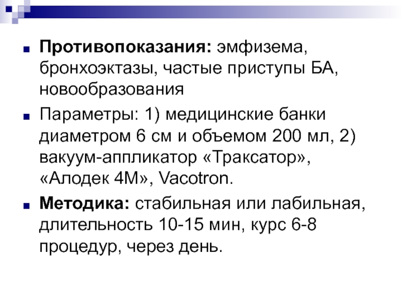 Противопоказания: эмфизема, бронхоэктазы, частые приступы БА, новообразования