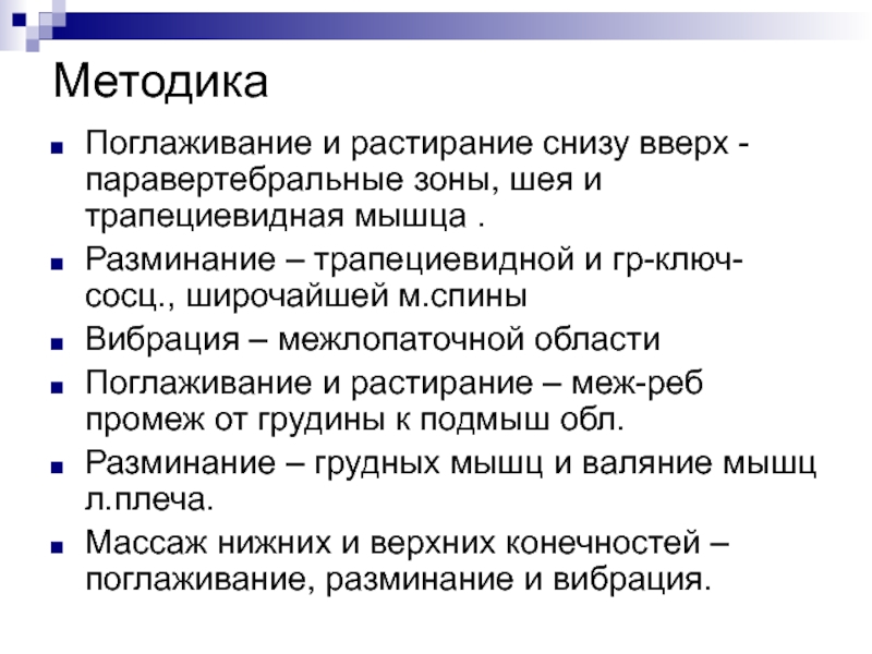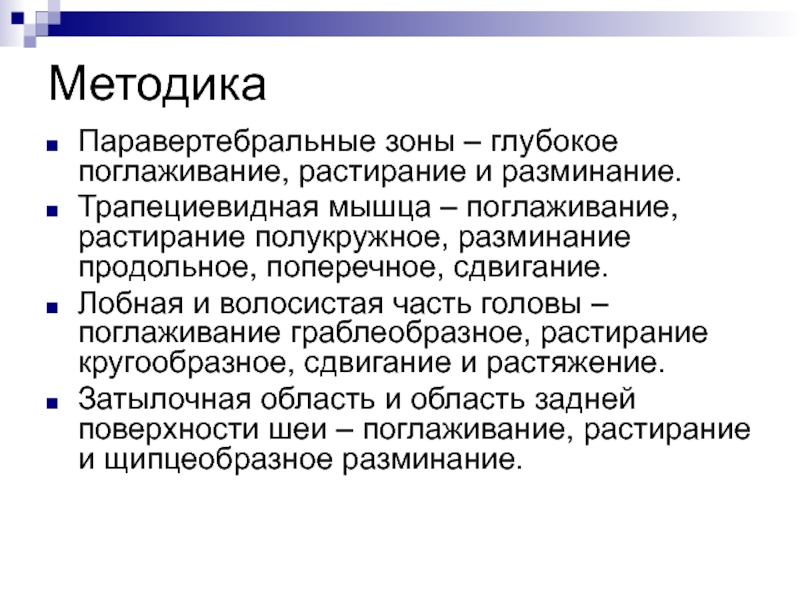 Начинают паравертебрально, по направлению к позвоночнику, на конечностях в направлении к проксимальному отделу