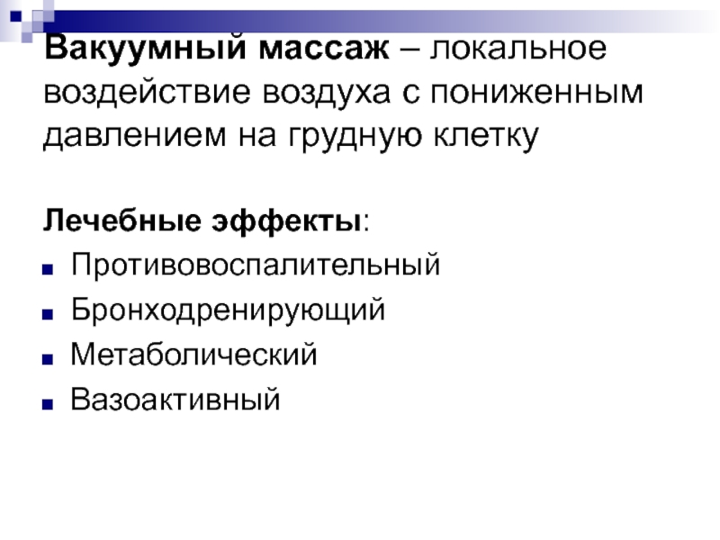 Слайд 64Вакуумный массаж – локальное воздействие воздуха с пониженным давлением на