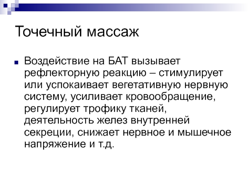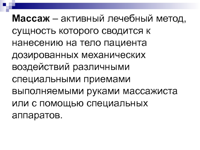 Слайд 3Массаж – активный лечебный метод, сущность которого сводится к нанесению
