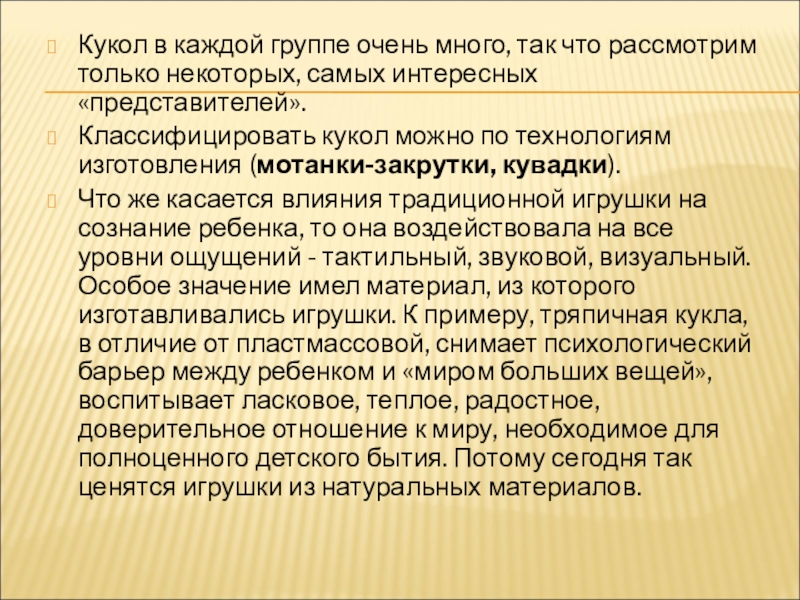 Что же касается влияния традиционной игрушки на сознание ребенка, то она воздействовала на все уровни ощущений - тактильный, звуковой, визуальный. Особое значение имел материал, из которого изготавливались игрушки. К примеру, тряпичная кукла, в отличие от пластмассовой, снимает психологический барьер между ребенком и «миром больших вещей», воспитывает ласковое, теплое, радостное, доверительное отношение к миру, необходимое для полноценного детского бытия. Потому сегодня так ценятся игрушки из натуральных материалов.