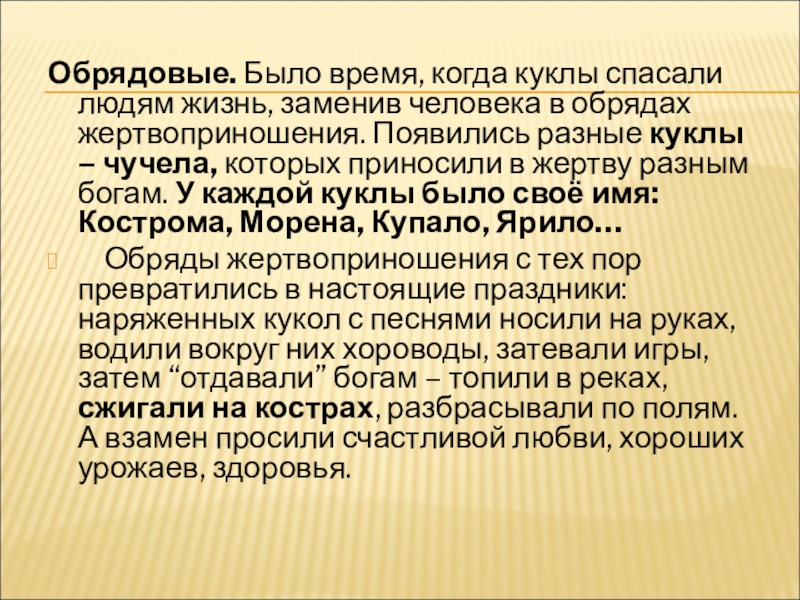 в жертву разным богам. У каждой куклы было своё имя: Кострома, Морена, Купало, Ярило…