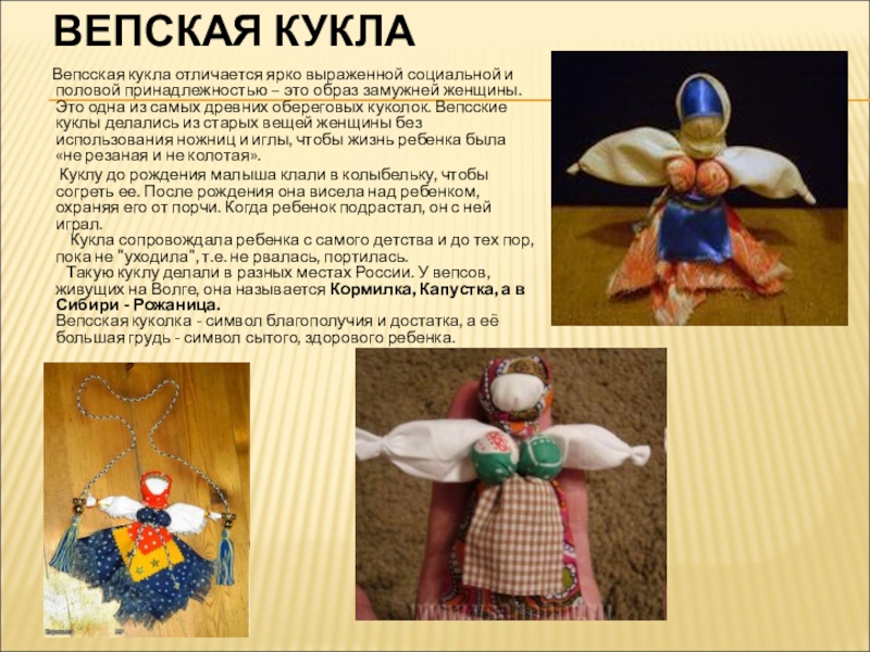 женщины. Это одна из самых древних обереговых куколок. Вепсские куклы делались из старых вещей женщины без использования ножниц и иглы, чтобы жизнь ребенка была «не резаная и не колотая».