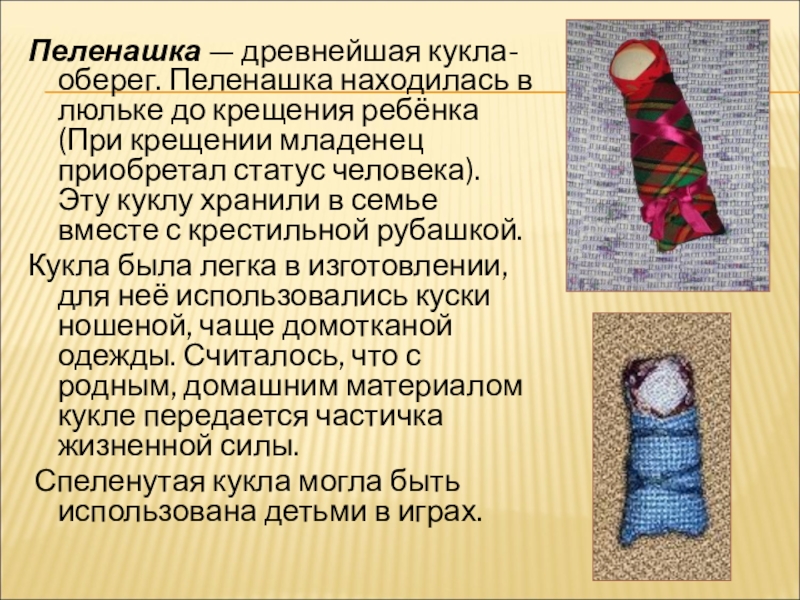 Слайд 5Пеленашка — древнейшая кукла-оберег. Пеленашка находилась в люльке до крещения