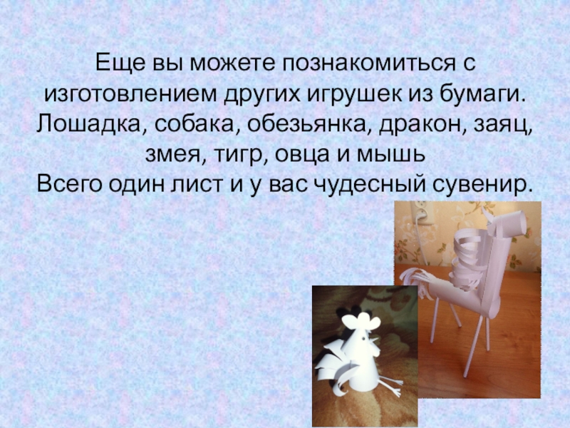 Слайд 16Еще вы можете познакомиться с изготовлением других игрушек из бумаги. Лошадка,