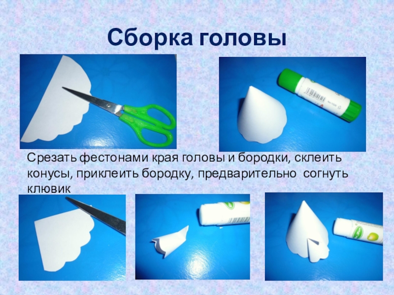 Срезать фестонами края головы и бородки, склеить конусы, приклеить