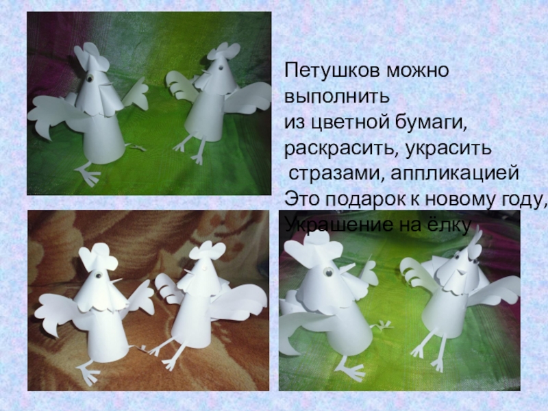 Петушков можно выполнить из цветной бумаги, раскрасить, украсить стразами, аппликациейЭто подарок к новому году, Украшение на ёлку