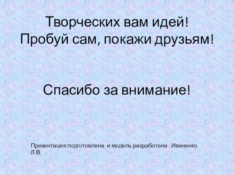 Творческих вам идей! Пробуй сам, покажи друзьям!   Спасибо за внимание!Презентация подготовлена и модель разработана