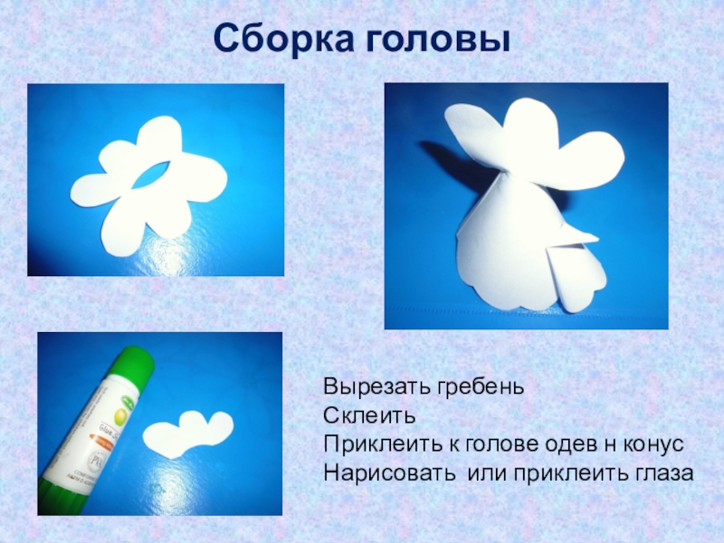 Сборка головы  Вырезать гребеньСклеить Приклеить к голове одев н конусНарисовать или приклеить глаза