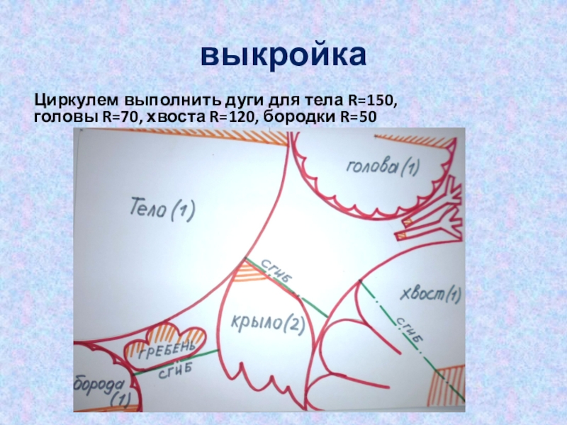 выкройкаЦиркулем выполнить дуги для тела R=150, головы R=70, хвоста R=120, бородки R=50