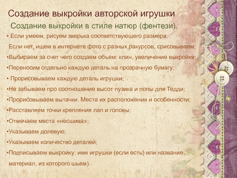 Создание выкройки авторской игрушкиЧитаем выкройки. Шаги.Проверяем наличие всех деталей выкройки.Проверяем пропорции деталей на фото и выкройке.Проверяем отсутствие/наличие