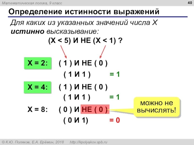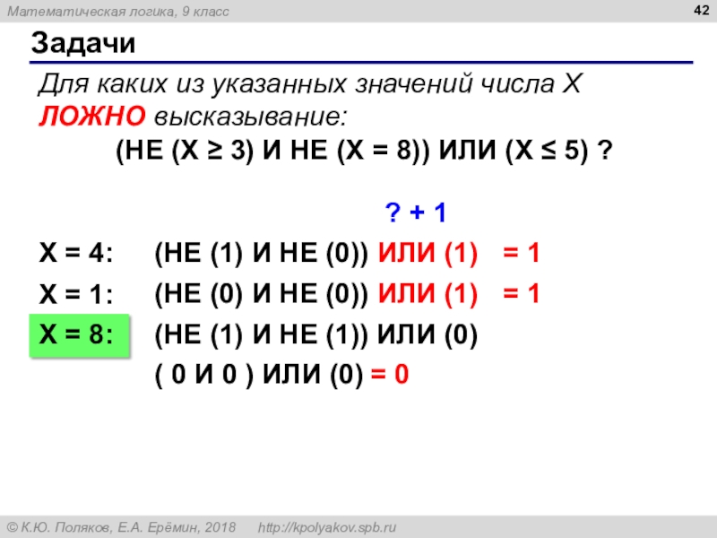 ЛОЖНО ( (X < 3) И (X <> 8)) ИЛИ (X ≤ 5)