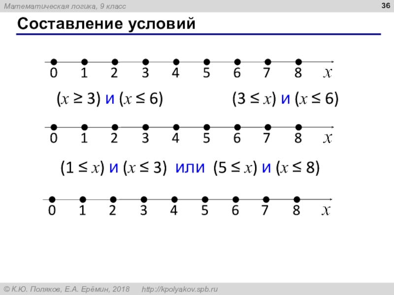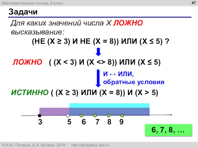ИСТИННО ( (X ≥ 3) ИЛИ (X = 8)) И (X > 5)