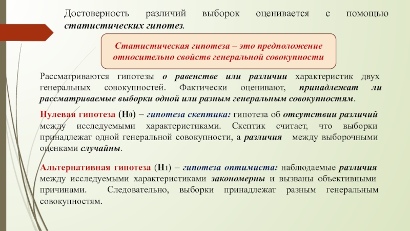 Нулевая гипотеза (Н0) – гипотеза скептика: гипотеза об отсутствии различий между исследуемыми характеристиками. Скептик считает, что выборки принадлежат одной генеральной совокупности, а различия между выборочными оценками случайны.
