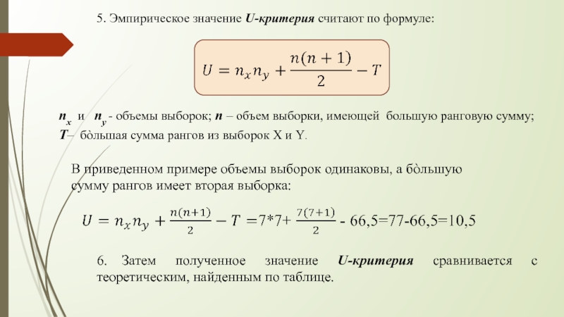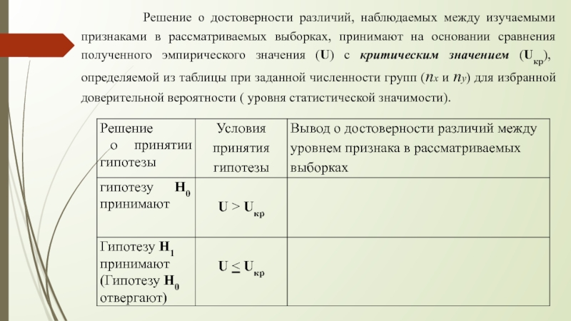 6. Затем полученное значение U-критерия сравнивается с теоретическим, найденным по таблице.